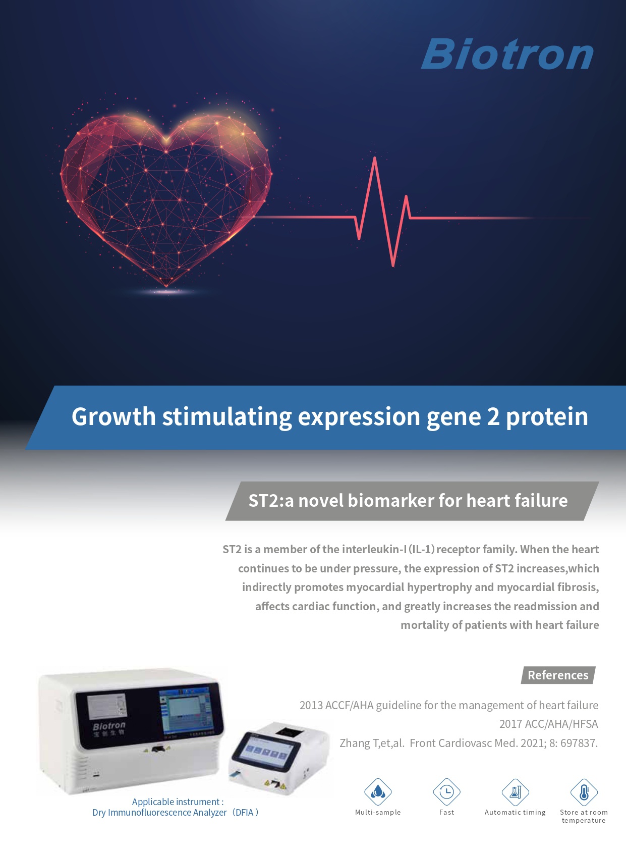 ST2 is a member of the interleukin-I(IL-1)receptor family. When the heart continues to be under pressure, the expression of ST2 increases, which indirectly promotes myocardial hypertrophy and myocardial fibrosis, affects cardiac function, and greatly increases the readmission and mortality of patients with heart failure.